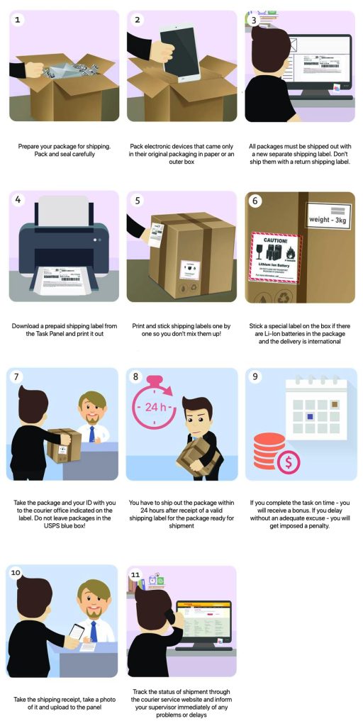 If you cannot ship out the package within the time specified for the excuse reason, you must inform your supervisor about impossibility to carry out your task in time. In case if you have not shipped out the package for inadequate excuse, you will get imposed with a penalty. This measure is related to the fact that our key competitive advantage is the reliability and speed of the tasks performance.